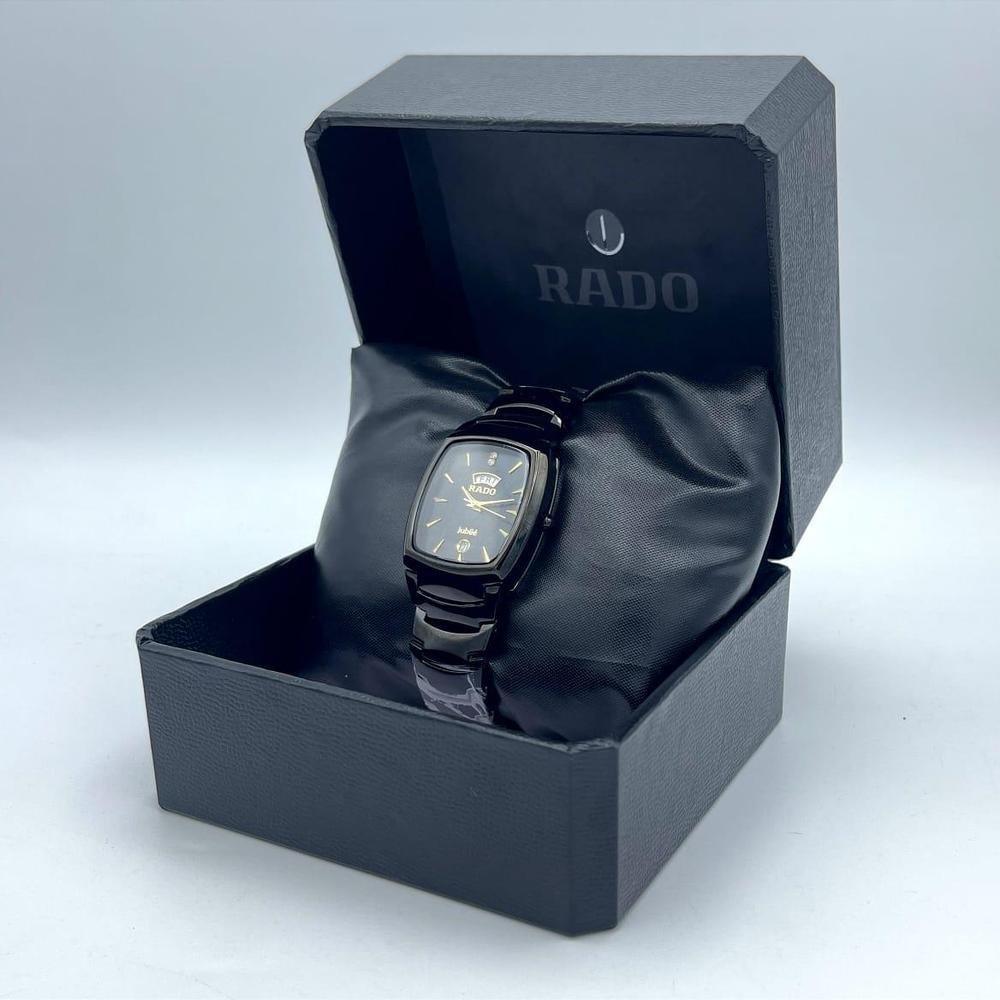 Discover refined elegance with the Rado Jubile Black Ceramic Men’s Watch, exclusively available at Kinzawatchcollection. This premium timepiece features a sleek rectangular black dial accented with gold-tone markers and hands, exuding sophistication. The integrated day and date display adds convenience, while the scratch-resistant high-tech ceramic case and bracelet ensure exceptional durability and a luxurious feel.